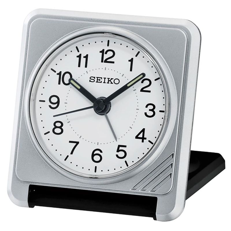En reisevekkeklokke fra Seiko i sølv, hvit urskive med arabiske tall og selvlysende visere, quartz urverk, alarm med Snooze funksjon.
