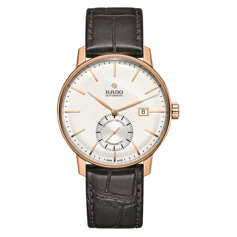 Rado Coupole Classic armbåndsur til herre, 41 mm, stål med rosé PVD, brun skinnrem med foldespenne, lys skive med tekstur og rosé visere, automatisk verk, 80 timer gangreserve, COSC-sertifisert, liten sekundviser, dato, safirglass, 5 bar