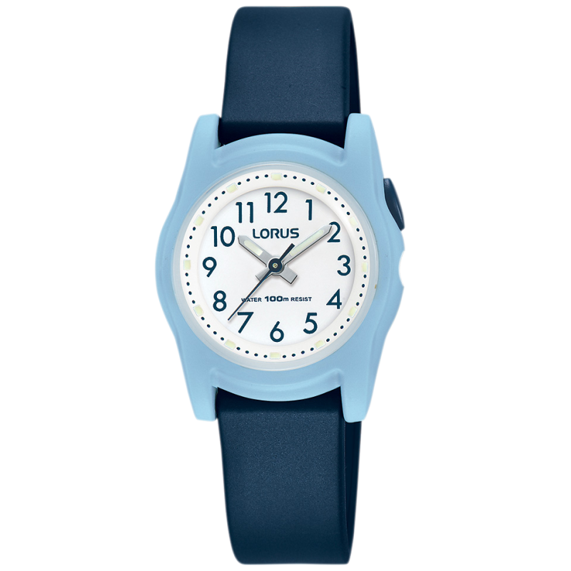 Lorus Kids R2385MX9. Flott barneklokke med hvit skive og mørkblå PU-reim. Vanntett ned til 100 meter. Quartz urverk.
