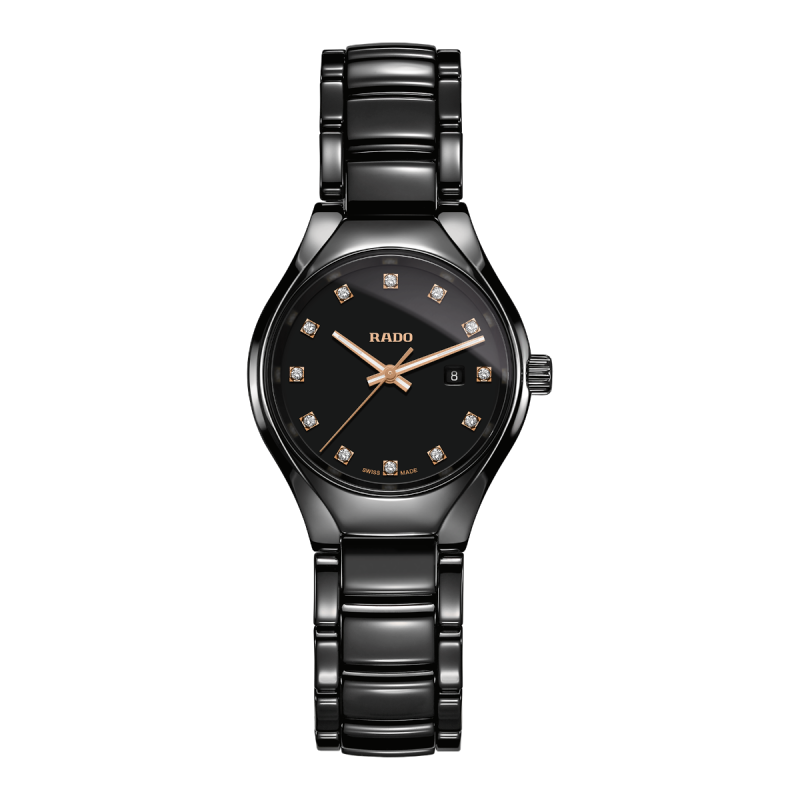 Rado True armbåndsur til dame, 30 mm, sort keramikk, lenke med foldespenne, sort skive med rosé visere og 12 diamanter (0,096kt), Sveitsisk quarts verk, dato, safirglass, 5 bar