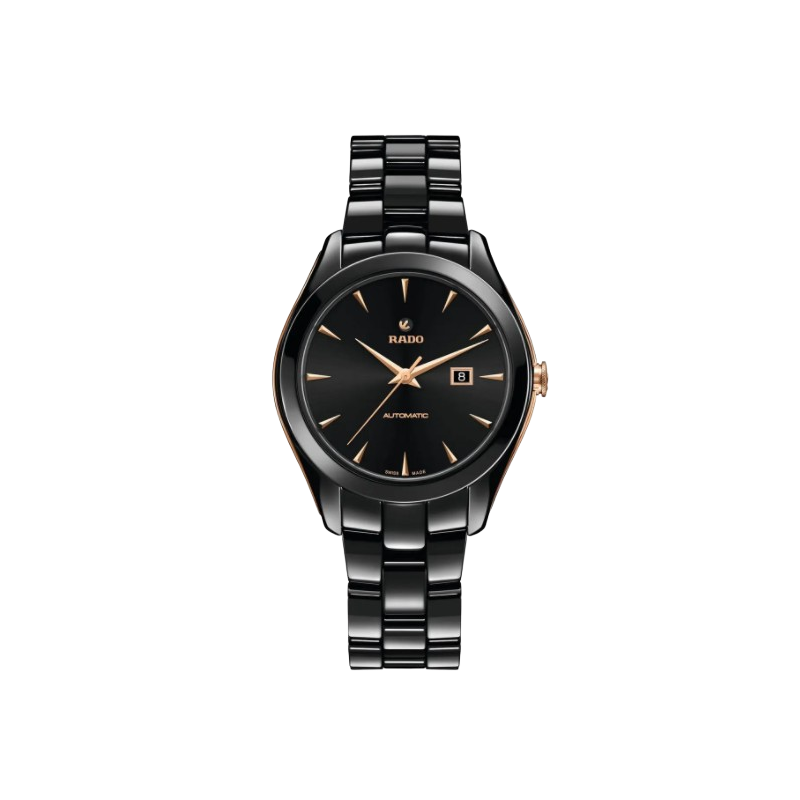 Rado Hyperchrome armbåndsur til herre, 36 mm, sort keramikk, lenke med foldespenne, sort skive med gullfarget visere, automatisk urverk, dato, safirglass, 5 bar