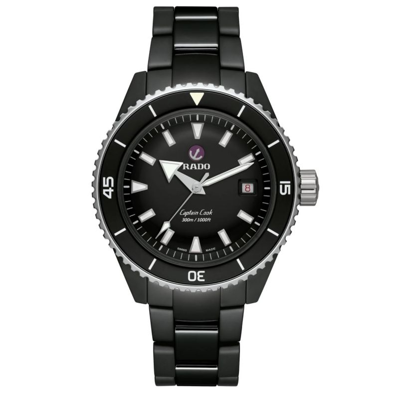 Captain Cook High-Tech Ceramic Diver-klokken er vanntett ned til 300 m. Visere og indekser til den ISO 6425-sertifiserte dykkerklokken er belagt med SuperLuminova® for å sikre utmerket synlighet på den svartlakkerte og polerte urskiven. Den 43 mm monoblokk-kassen er laget av matt svart høyteknologisk keramikk, mens den roterende rammen er laget av herdet, polert rustfritt stål. Innvendig overgår den automatiske Rado R763-bevegelsen standard nøyaktighetstestkrav fra 3 til 5 posisjoner og tilbyr 80 timers gangreserve. Denne modellen kommer med et polert, svart, høyteknologisk keramisk armbånd.