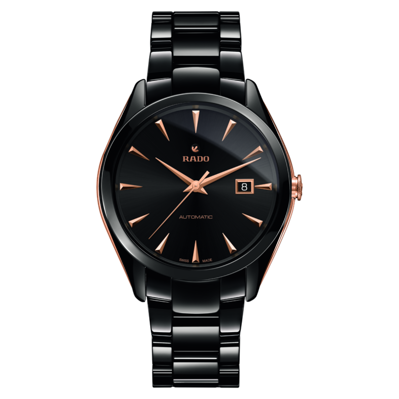 Rado Hyperchrome armbåndsur til herre, 42 mm, sort keramikk og rosé PVD, lenke med foldespenne, sort skive med rosé visere, automatisk Rado C07 verk, 80 timer gangreserve, dato, safirglass, glass baklokk, 5 bar