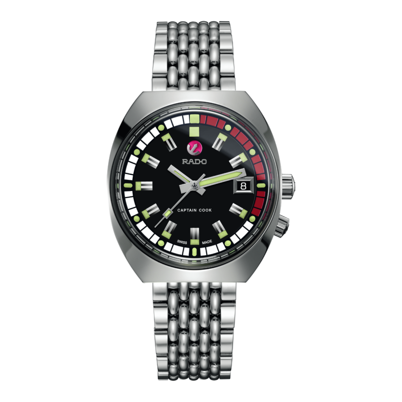 Rado Captain Cook Mk II armbåndsur til herre, 37 mm, stål, stål lenke og NATO-rem, sort skive med sølv Super-LumiNova® visere, automatisk verk, 80 timer gangreserve, dato, safirglass, 22 bar