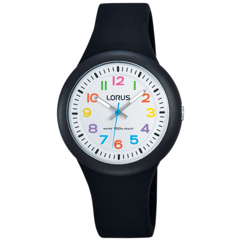 Lorus Kids RRX41EX9. Flott barneklokke med hvit skive og sort silikoreim. Vanntett ned til 100 meter. Quartz urverk.
