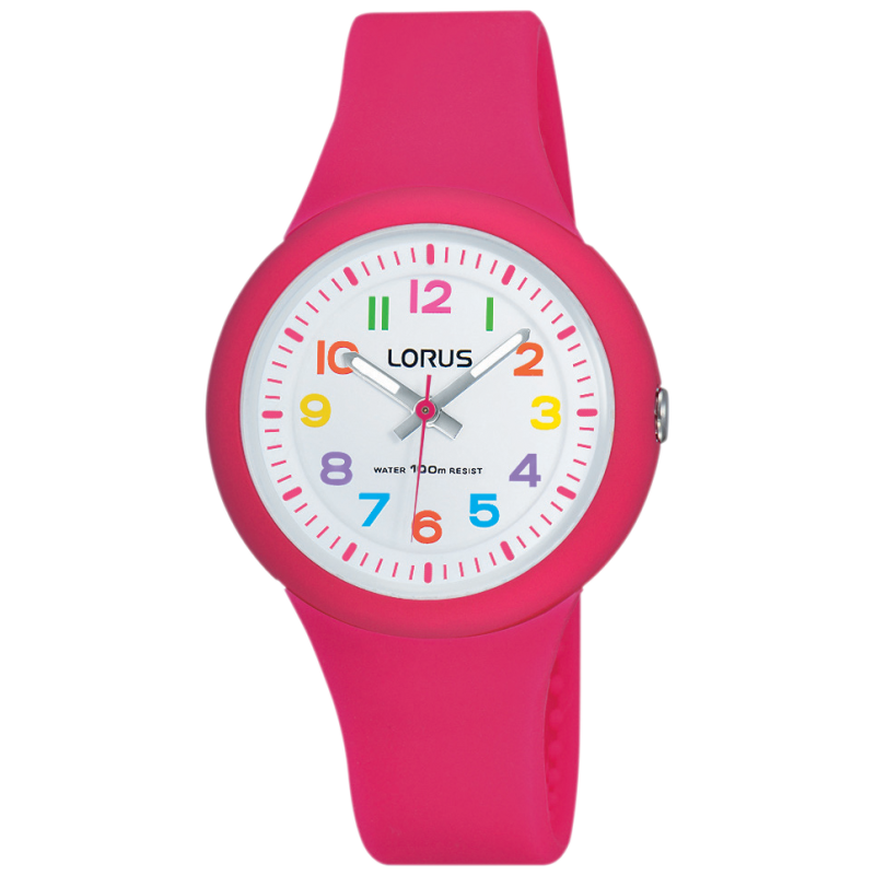 Lorus Kids RRX49EX9. Flott barneklokke med hvit skive og rosa silikonreim. Vanntett ned til 100 meter. Quartz urverk.