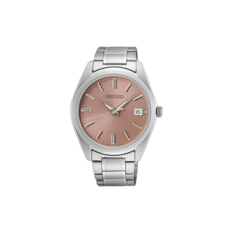 Seiko Mens 40,2 mm armbåndsur til herre med en rosa skive og sållenke. Klokken drives av et quartzverk med 3 års batterilevetid. Vanntett ned til 100 meter.