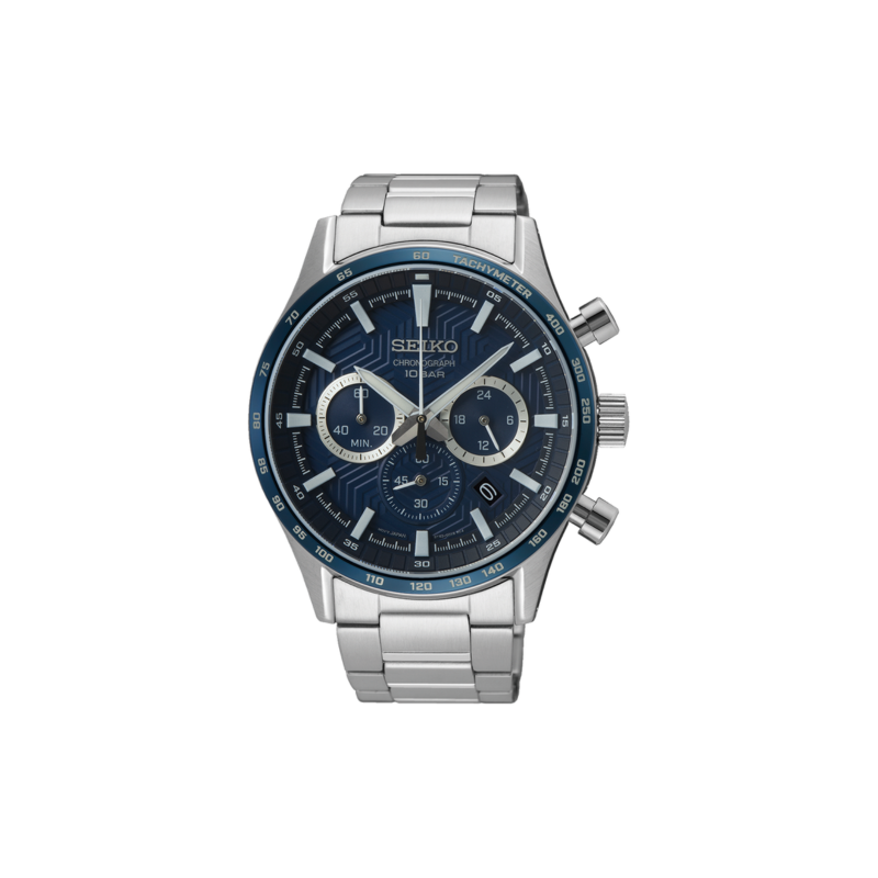 Seiko Mens Chronograph 43 mm armbåndsur til herre med en lekker blå skive. Klokken dirves av et quartzverk med opptil 3 års batterilevetid. Lumibrite på visere og indekser. Vanntett ned til 100 meter.