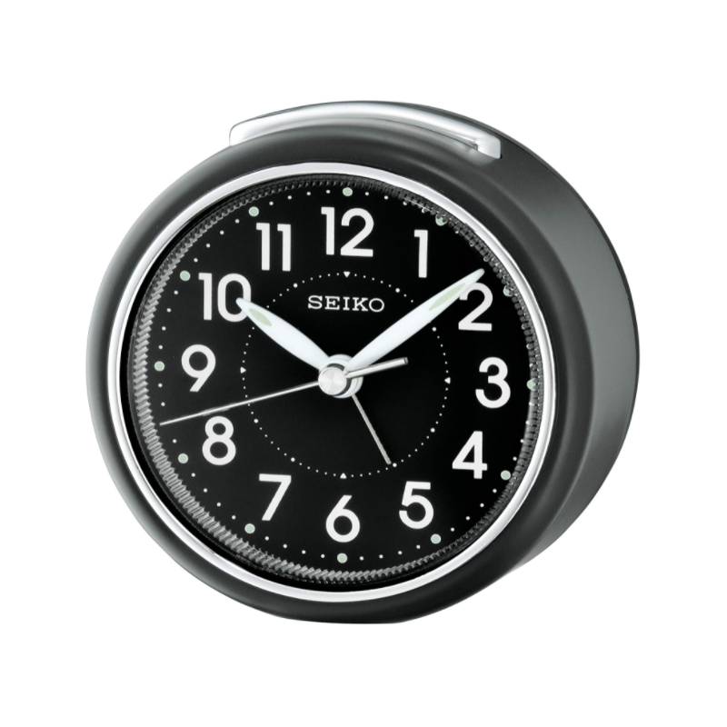 Seiko vekkerklokke i sort med fluoriserende arabiske tall. Utstyrt med ett av Seiko sine solide synkron-verk er dette en vekkerklokke som ikke tikker. Slumre funksjon, lys, tidløst design og enkel stilling av både tid og alarm gjør dette til en favoritt blant vekkerklokker.