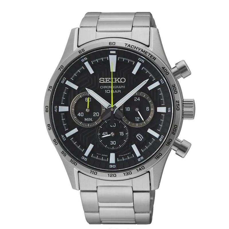 Seiko Mens Dress Chronograph er et stilig 43 mm armbåndsur for herre. Klokken har en sort skive som presenteres på en lenke i stål med foldespenne. Urverket i klokken er calibre 8T63 som er et quartz-urverk. Vanntett ned til 100 meter.
