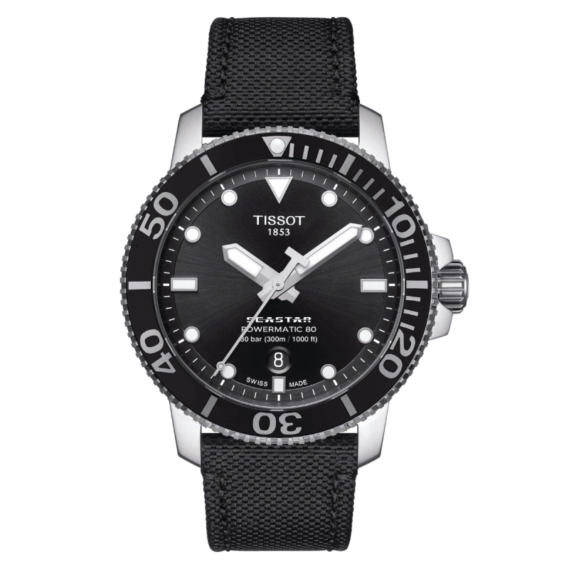 Tissot Seastar 1000 armbåndsur til herre, 43 mm, stål, tekstil rem med foldespenne, dreibar keramisk bezel, sort skive med sølv Super-LumiNova® visere, automatisk Powermatic 80.111 verk, 80 timer gangreserve, dato, safirglass, 30 bar, glass baklokk
