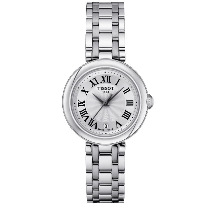 Klokken har en sølv urskive med romertall og datovisning ved klokken 6. Quartzur. Leveres på en stållenke. Sorte visere, safirglass.