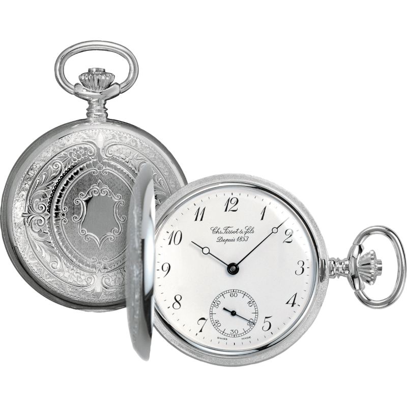 Klassisk lommeur fra Tissot basert på det velprøvde og solide mekaniske ETA 6498 verket. Kasse i sølv, klassisk hvit skive med sorte arabiske tall, Breguet visere og liten sekundviser.