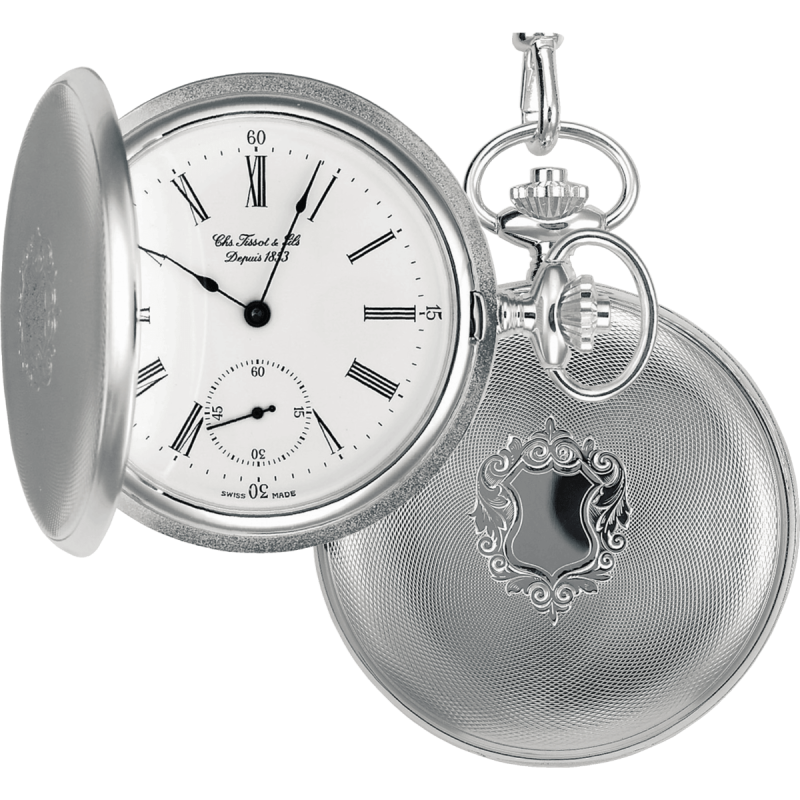Klassisk lommeur fra Tissot basert på det velprøvde og solide mekaniske ETA 6498 verket. Kasse i sølv, hvit skive med romertall, liten sekundviser og medfølgende kjede.
