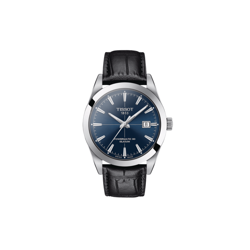 Tissot Gentleman Powermatic 80 Silicium er et 40 mm armbåndsur til herre med blå skive som presenteres på en sort skinnrem. Klokken drives av et automatikk-urverk med gangreserve på opptil 80 timer. Vanntett ned til 100 meter.