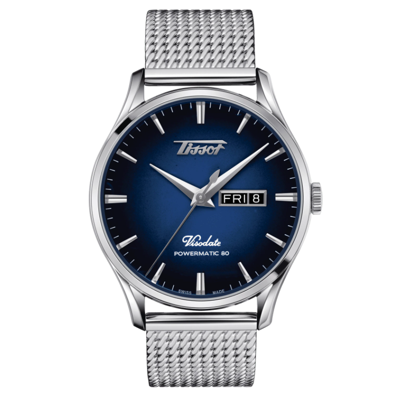 Tissot Heritage Visodate armbåndsur til herre, 42 mm, stål, mesh lenke, blå skive med Dauphine visere i sølv, Powermatic 80.121 urverk med 80 timer gangreserve, dag, dato, buet safirglass, 3 bar, glass baklokk.