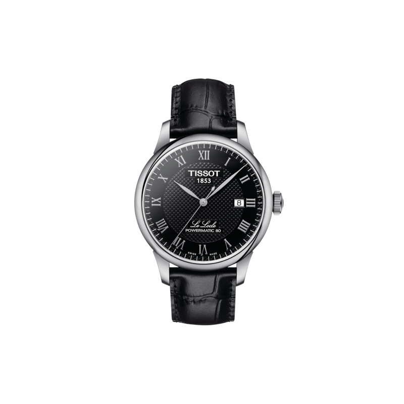 Tissot Le Locle Powermatic 80 er et 39,3 mm armbåndsur til herre med en sort skive som presenteres på en sort skinnrem. Klokken drives av et automatikk-urverk med opptil 80 timers gangreserve. Vanntett ned til 30 meter.