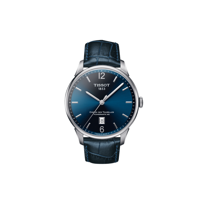 Tissot Powermatic 80 er et 42 mm armbåndsur til herre med blå skive og skinnrem. Klokken drives av et automatikk-urverk. Vanntett ned til 50 meter.