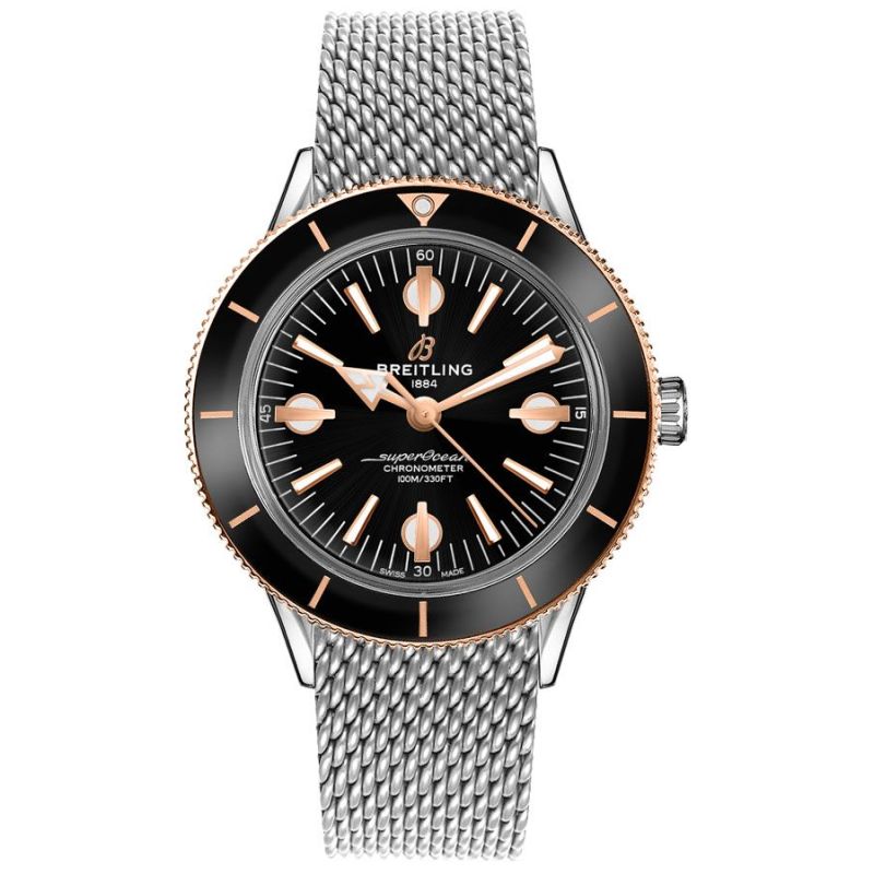 Breitling Superocean Heritage, 42 mm. Automatiskt, selvtrekkende. 100 meter vanntetthet. Sort med selvlysende markerer indeksmarkeringer, selvlysende visere. Keramik 18 karat rosé gull, sort, dreibar med og mot klokken.