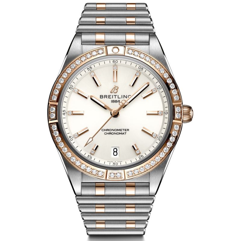 Breitling Chronomat armbåndsur til dame, 36 mm, stål og 18K roségull, rouleauxlenke med foldespenne, diamantbesatt gull-bezel, sølv skive med rosé indekser og visere, automatisk Breitling Caliber 10 urverk, dato, safirglass, stål baklokk, 10 bar 2 år garanti Ref. U10380591A1U1