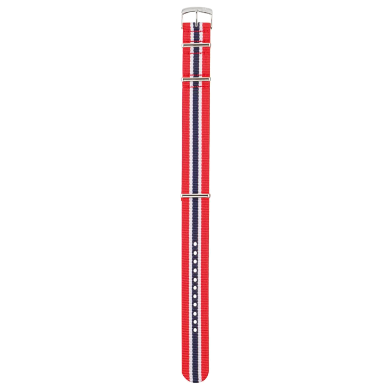 Flerfarget Morellato NATO-rem i vevet tekstil. Striper i det norske fargene rødt, hvitt og blått. Klassisk spenne i stål.