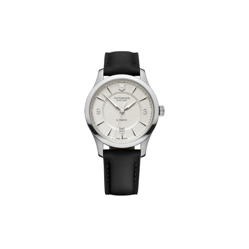 Victorniox Alliance 40 mm armbåndsur til herre med en sølvfarget skive som presenteres på en skinnrem. Klokken drives av calibre ETA 2892 som er et automatikk-urverk med 42 timers gangreserve. Vanntett ned til 100 meter.