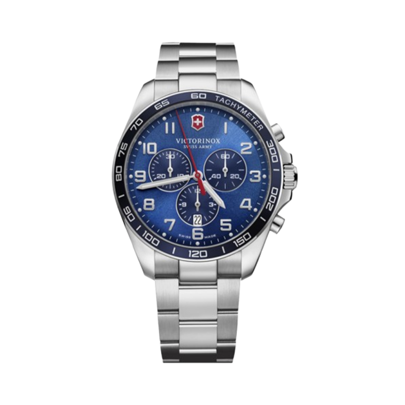 Victorinox Fieldforce Classic Chrono 42 mm armbåndsur til herre med blå skive som presenteres på en stållenke med foldespenne. Klokken drives av et quartz-verk og er vanntett ned til 100 meter.