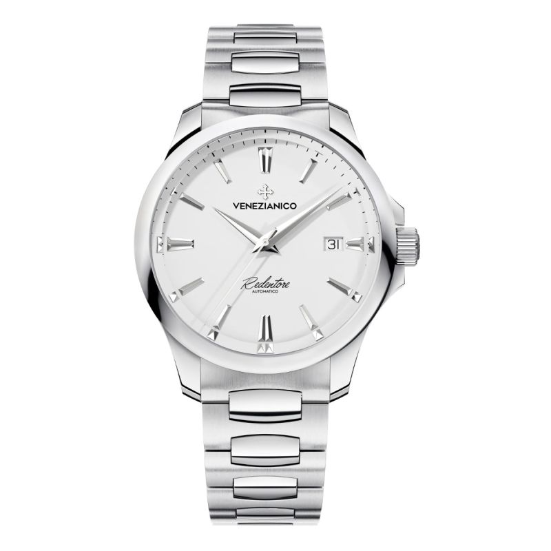 Venezianico Redentore 40 mm armbåndsur til herre med hvit skive og canova lenke. Designet til denne klokken er inspirert av Basilica del Redentore, mesterverket til den venetianske arkitekten Andrea Palladio, kjent som faren til den nyklassisistiske stilen. Balansen mellom formene og proporsjonene gir kassen et elegant og moderne utseende, noe som gjør den til en ekstremt allsidig modell. Klokken har et automatikk-urverk med 41 timers gangreserve og er vanntett ned til 100 meter.