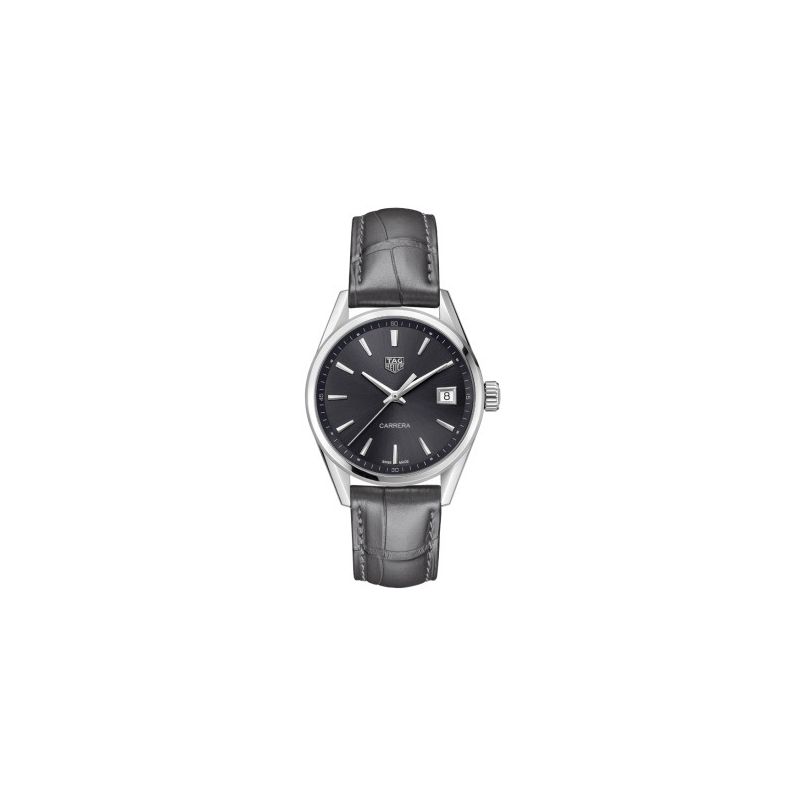 Tag Heuer Carrera armbåndsur til dame, 36 mm, stål, grå alligator-skinnrem med foldespenne, grå skive med sølv visere, sveitsisk quartz urverk, dato, buet safirglass med antirefleksbehandling, 10 bar